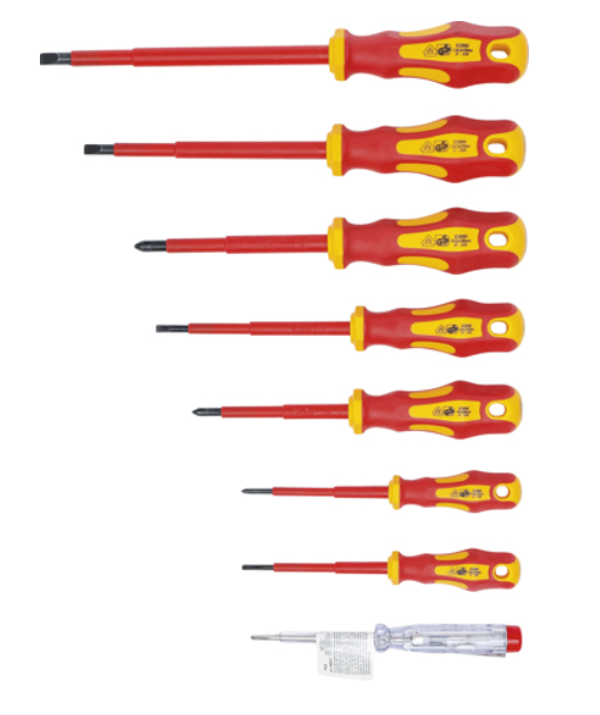 BGS VDE ruuvitalttasarja 8-osainen. 2-komponenttinen liukastumista estävä kahva. VDE-testattu DIN EN 60900:n mukaisesti.