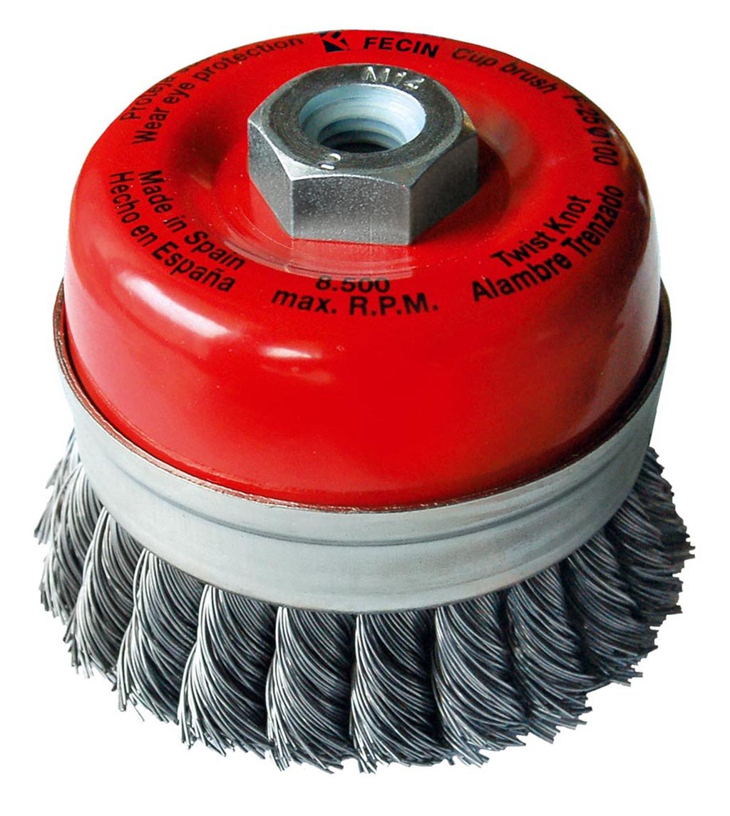 FECIN kuppiteräsharja, punottu teräslanka Ø 0,5 mm. M14-kierre. RPM suositus 6500, max 8500.