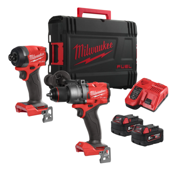 Milwaukee M18 Fuel PowePack setti. Sisältää: M18 FPD3 iskuporakoneen, M18 FID3 1/4" HEX iskevän ruuvinvääntimen, 2x M18 B5 5,0 Ah akkuja, sekä M12-M18 FC pikalaturin.