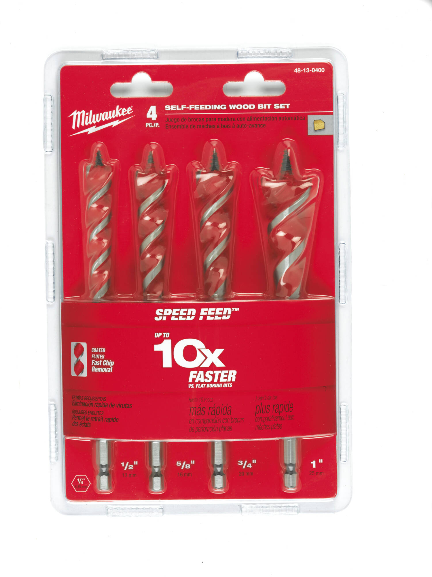Milwaukee Speed Feed puuporanteräsarja, 4-osainen. Poraa nopeammin, kestävät pidempään ja eivät jumiudu yhtä helposti. Kaksisärmäiset terät katkaisevat jopa 10 x nopeammin ja aggressiivisemmin verrattuna lattaporanteriin. Syöttöruuvi karkealla kärjellä lisää itsesyöttöominaisuutta kaikissa puutyypeissä (pehmeä, kova, märkä, käsitelty). Sisältää: 13 / 16 / 20 / 25 mm.