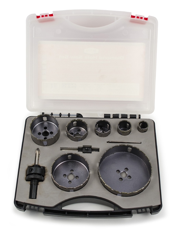 Reikäsaha sarja, timantti, 10-osainen. Sisältää: 22, 30, 35, 46, 60, 76 ja 105 mm. Pieni ja iso istukka timanttireikäsahoille ja kuusiokoloavain.