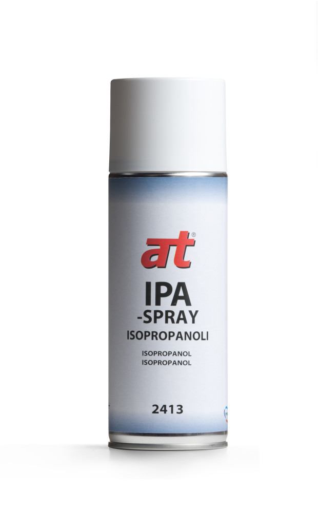 AT IPA-Spray isopropanoli. Alkoholipohjainen yleispuhdistusaine joka puhdistaa jäänteettömästi. Soveltuu useimmille materiaaleille. Hajottaa rasva- sekä vesipohjaisen lian.