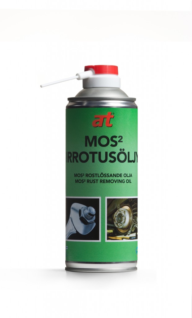 AT MOS2 irroitusöljy. Ruosteenirrottaja, voiteluaine ja tunkeutuva öljy yhdessä tuotteessa. Estää osien uudelleen juuttumisen. Erinomainen voitelukyky myös korkeissa paineissa. Suojaa tehokkaasti ruostumiselta ja lopettaa jo alkaneen korroosion. Silikonivapaa, sekä stabiili ilma- ja happiolosuhteissa. Lämmönkesto -30°C…+450°C.