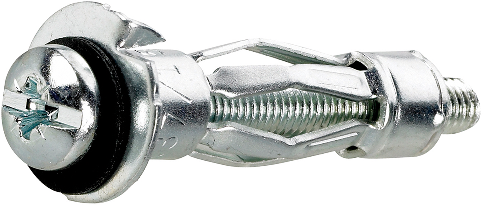 Levyankkuri, kuusiokanta ruuvilla, metalli. Täysmetallinen kiinnike kuormien kiinnittämiseen levy- ja koteloseiniin. Kiinnikkeen siivekkeet levittäytyvät tukevasti ohutlevyn, kuten kipsilevyn, sisäpintaa vasten. Kannattelee suuriakin kuormia tukevasti.