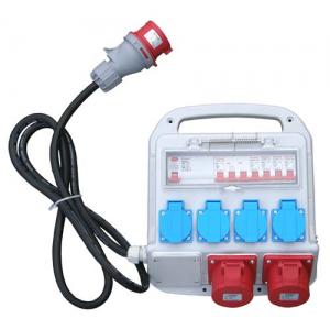 Työmaa alakeskus. 4 x schuko, 2 x 16 A/380 V, 2 m kaapeli 5x2,5 mm2 H07RN-F. Johdonsuoja 3-nap 16 A, 4x johdonsuoja 1-nap 16 A + vikavirtasuoja 25 A/4-napainen 30 mA/400 V.