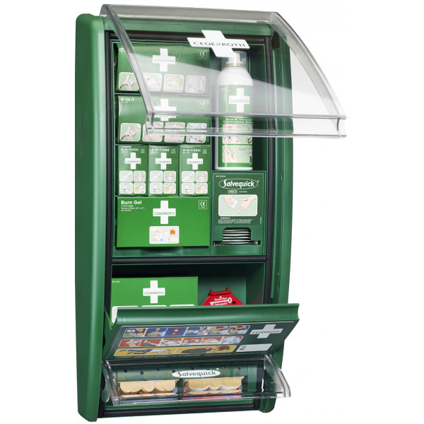 Sisältää: 2kpl Cederroth 4-in-1 iso ensiapuside, 3kpl Cederroth 4-in-1 pieni ensiapuside, 1kpl Cederroth Burn Gel palovammataitos, 2 kpl/ras, 1kpl Cederroth huuhteluspray, 150 ml, 1kpl Salvequick laastariautomaatti, sis. 40 kpl kangaslaastari ja 45kpl muovilaastari, 1kpl Salvequick haavapyyhe, 20 kpl, 1kpl Cederroth tartuntasuojapakkaus, 1kpl ensiapuohje, 1kpl Laastari- ja haavapyyheautomaatin avain.