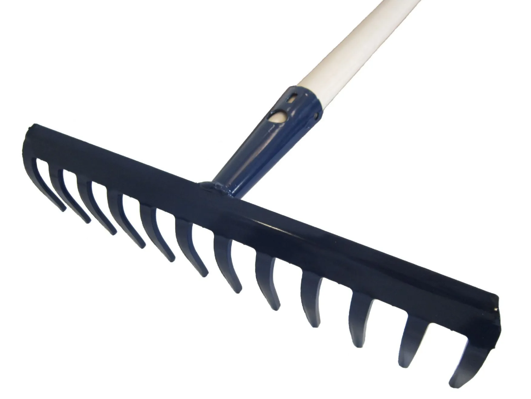 12-piikkinen rautaharava. Piikit 4 mm terästä, puuvarsi, pituus 145 cm, paino 0,8 kg.